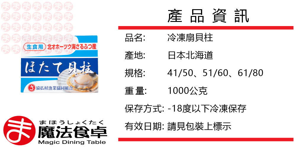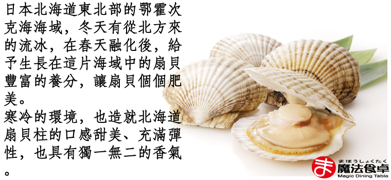 日本北海道直送,採用當季旬味肥美的活貝,捕撈、卸到漁港後,立即在港邊的加工廠加工並經過超低溫急速冷凍,保持絕佳鮮度。符合日本生食級標準,解凍後可直接食用。建議料理方式為奶油煎、乾煎、炒菜、火鍋、燒烤。