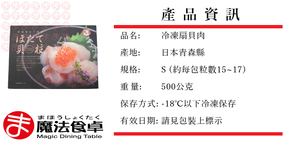 日本青森縣直送,採用當季旬味肥美的活貝,由青森縣漁連監製加工,使用急速冷凍技術,完美保存帆立貝的鮮美。符合日本生食級標準,解凍後可直接食用。建議料理方式為奶油煎、炒菜、茶碗蒸、火鍋、燒烤。